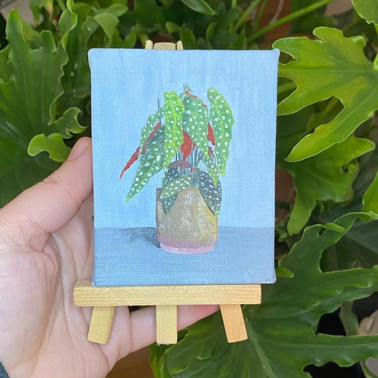 Hand painted gouache on canvas. Sealed with matte finish to protect paint. Wooden easel included with purchase.