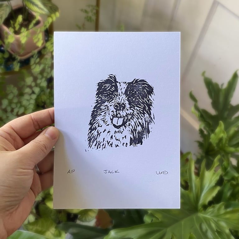 Signed and numbered handprinted one color linocut on 130lb cardstock
